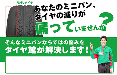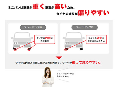 普通車よりも大きくて重いミニバンは、タイヤが偏って減りやすいってご存知ですか?そんなミニバンならではのお悩みを解決してくれるのが、ミニバン専用タイヤ。タイヤ館なら、たくさんのミニバン専用タイヤの中からクルマ特性や普段の乗り方、ご予算などに応じて、ピッタリなタイヤを選べます!