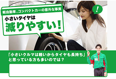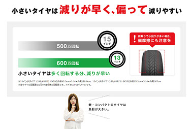 実は、軽自動車やコンパクトカーが使用する直径の小さいタイヤは、普通車より10~15パーセントも多く回転するため、早く消耗します。また、街乗りは小回りが多いことから、偏って減ることも。まずはタイヤ館で、タイヤの状態をチェックしてみては!?